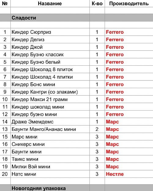 Киндер Сюрприз (1 шт), Киндер Делиз (1 шт),Киндер Джой (1 шт), Киндер Буэно классик (1 шт), Киндер Буэно белый / темный (1 шт), Киндер Шоколад 8 плиток (1 шт), Киндер Шоколад 4 плитки (1 шт), Киндер Бонс (1 шт), Киндер Кантри (со злаками) (1 шт), Киндер Макси 21 грамм (1 шт), Киндер шоколад мини (1 шт), Киндер буэно мини (1 шт)