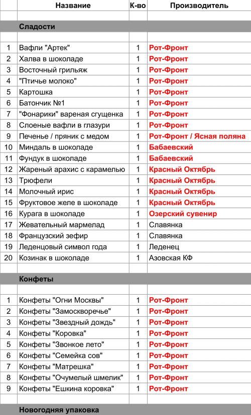 Вафли "Артек" (1 шт), Халва в шоколаде (1 шт), Восточный грильяж (1 шт), "Птичье молоко" (1 шт), Картошка (1 шт), Батончик №1 (1 шт), "Фонарики" вареная сгущенка (1 шт), Слоеные вафли в глазури (1 шт), Печенье / пряник с медом (1 шт), Конфеты "Огни Москвы" (1 шт), Конфеты "Замоскворечье" (1 шт), Конфеты "Звездный дождь" (1 шт), Конфеты "Коровка" (1 шт), Конфеты "Звонкое лето" (1 шт), Конфеты "Семейка сов" (1 шт), Конфеты "Матрешка" (1 шт), Конфеты "Очумелый шмелик" (1 шт), Конфеты "Ешкина коровка" (1 шт)